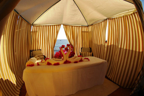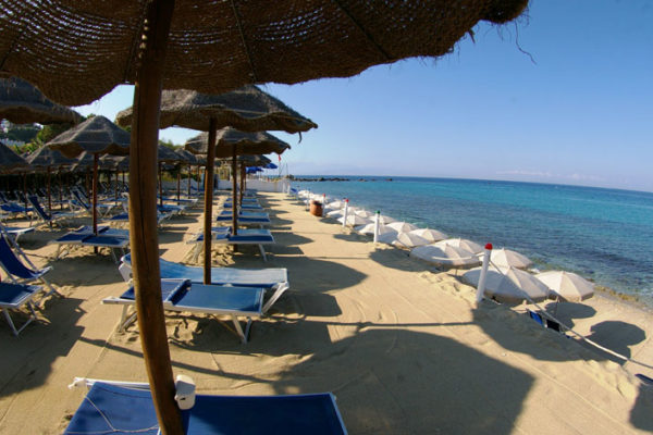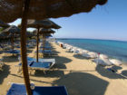 Der Sandstrand ist über eine kleine Straße erreichbar die außerhalb der Anlage liegt. Für jedes Zimmer ist ein Sonnenschirm und zwei Liegen reserviert.