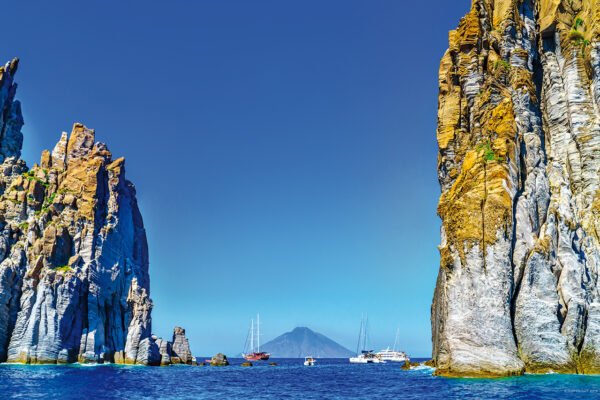 • Vista di Strombolicchio, l’antico vulcano spento nel mare