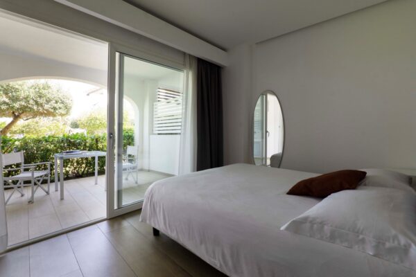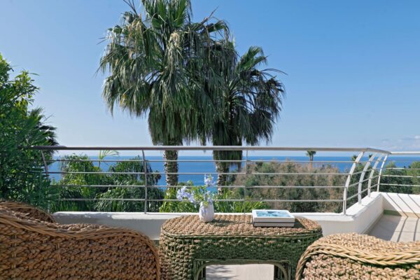 Camera da 27mq e 50 mq di terrazzo panoramico con magnifica vista mare, moderna ed elegante, provvista di ogni confort, silenziosa, luminosa e dotata di un rilassante sistema doccia cromoterapico, letto King Size, accapatoio, coffe maker, bollitore, bilancia e vasca idromassaggio sul terrazzo.