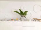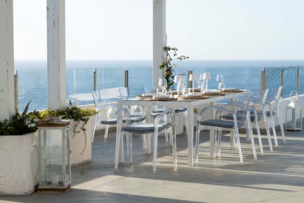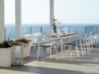 La grande veranda è la continuazione di una sala luminosa ed elegante, i tavoli a bordo della piscina principale e godono di un panorama mozzafiato sul mare infinito.