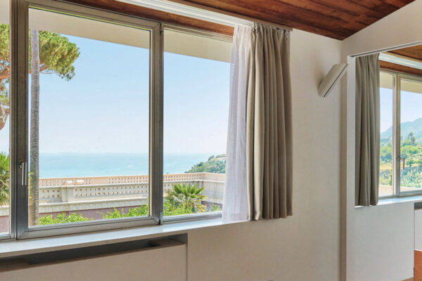 La villa nel suo insieme è costituita da un continuo alternarsi di giardini su più livelli con prati all’inglese, piante spettacolari, con un secolare Pino marittimo maestoso sulla terrazza esterna che delimita la fronte dell’edificio verso il mare con palme e verde ornamentale.
