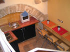 Dalla cucina si accede, tramite una scala ricavata nella roccia, alla camera da letto con bagno-doccia idromassaggio ed un balcone con vista mare.